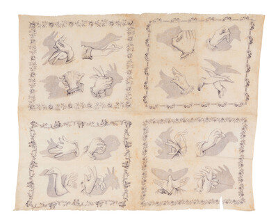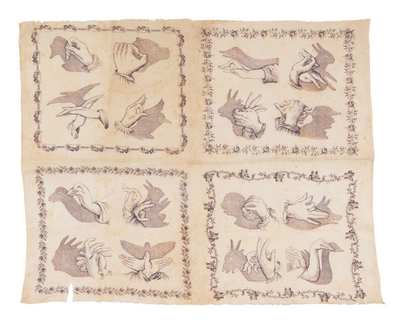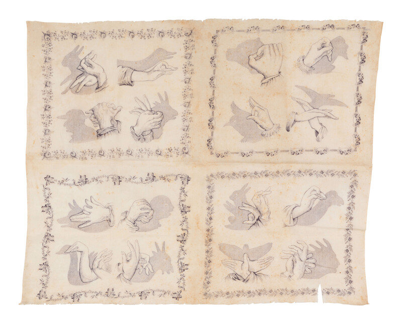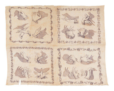 23 1/2 x 19 in. handkerchief (fraying to 2 edges, some separations and abundant spotting throughout). Featured in 4 florally bordered quadrants are illustrations of hands contorted into various positions, with the resulting shadow effect shown just to the side. Many of the shadows seem to depict various animals including a rabbit, a goat, various birds, and others.