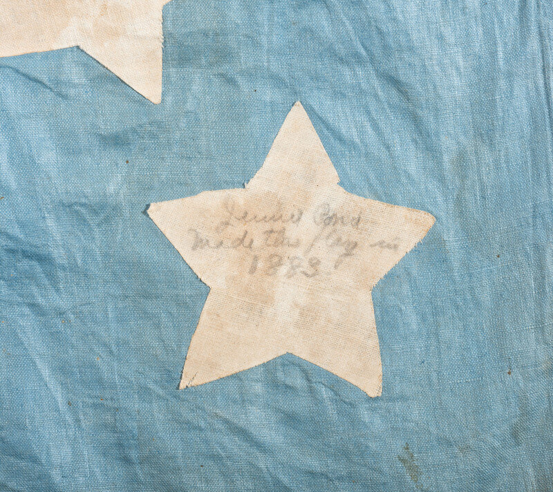 36 3/4 x 54 1/2 in. cotton flag comprised of 13 cotton stars mounted with adhesive to each side of a light blue canton, with 13 machine-sewn, dark red and white stripes. Small string through hoist end. One star on reverse side of canton inscribed, "Jenny Pond made this flag in 1883." No further provenance accompanies the flag.