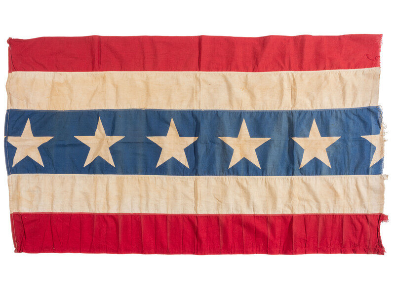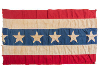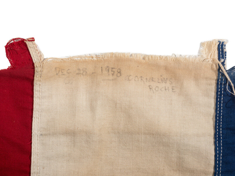 Cotton bunting featuring printed stars against a blue ground at center, with red and white machine-sewn stripes above and below the stars, 31 1/2 x 54 1/2 in. Provenance: Collection of Cornelius Roche; private collector (inked notation near edge of bunting dated Dec. 28, 1958). With modern label with handwritten notation indicating that the "Patriotic Bunting" was a souvenir from the National Football League Championship Game between the New York Giants and the Baltimore Colts on December 28, 1958, considered by some to be the "Greatest football game ever played." Collected by Cornelius Roche, who also reportedly owned the "uprights" at Memorial Stadium in Baltimore.