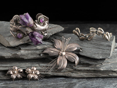 a silver and amethyst cuff bracelet, marked STERLING MEXICO