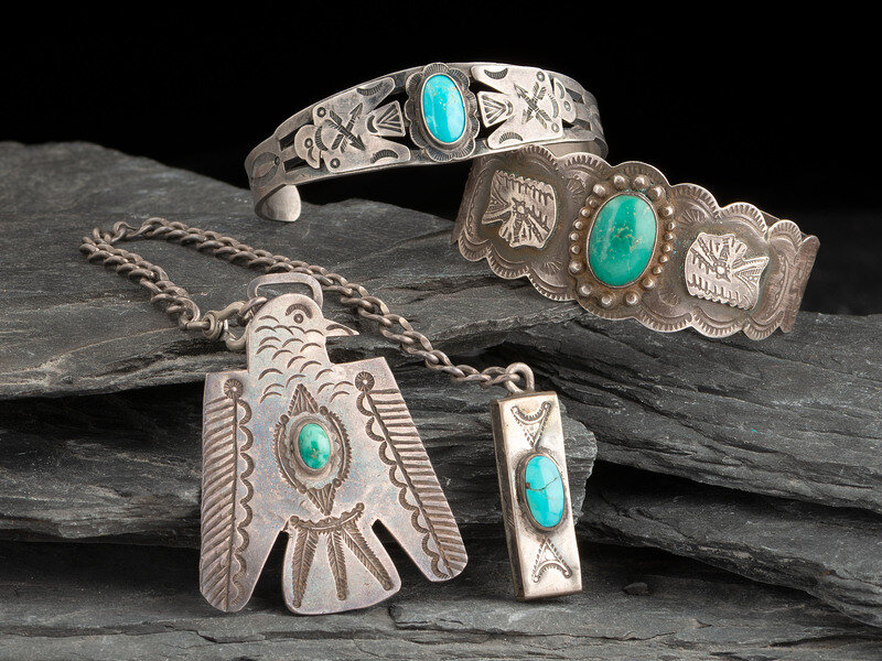 a Navajo example wth thunderbirds and set with turquoise, not marked