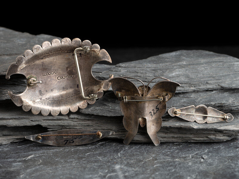 a belt buckle set with three stones; signed WOODY CRUMBO (Potawatomi, 1912-1989)