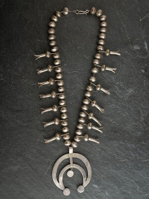 single-strand necklace strung with fourteen squash blossoms and featuring a carinated double crescent naja with chiseled designs; not marked
