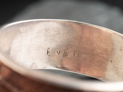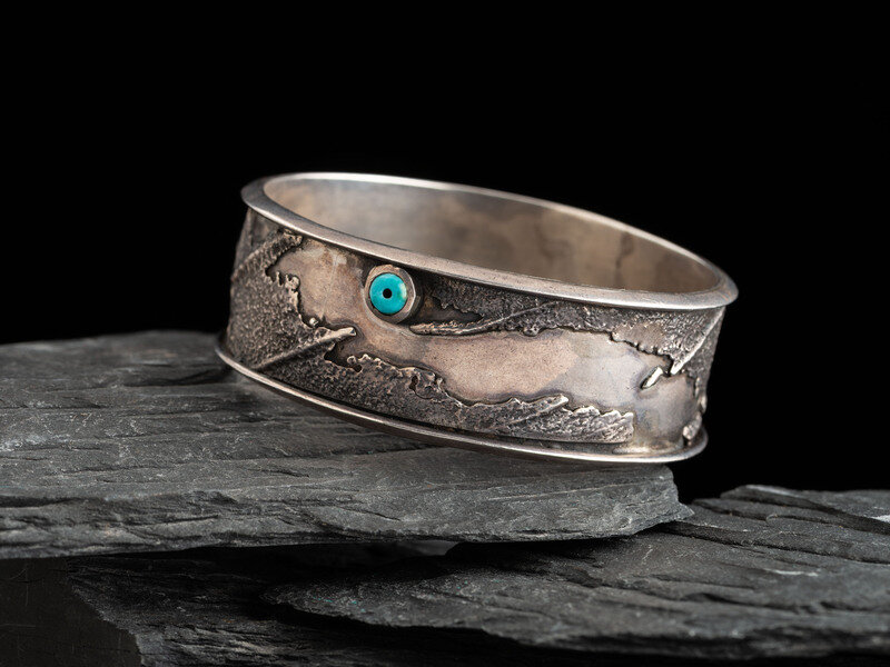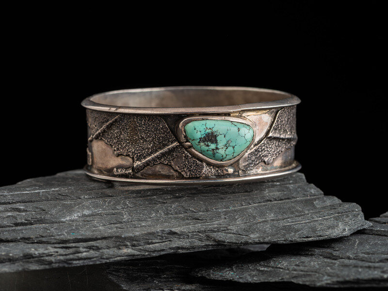set with a single drilled turquoise bead and a single turquoise stone; signed EVELI on interior