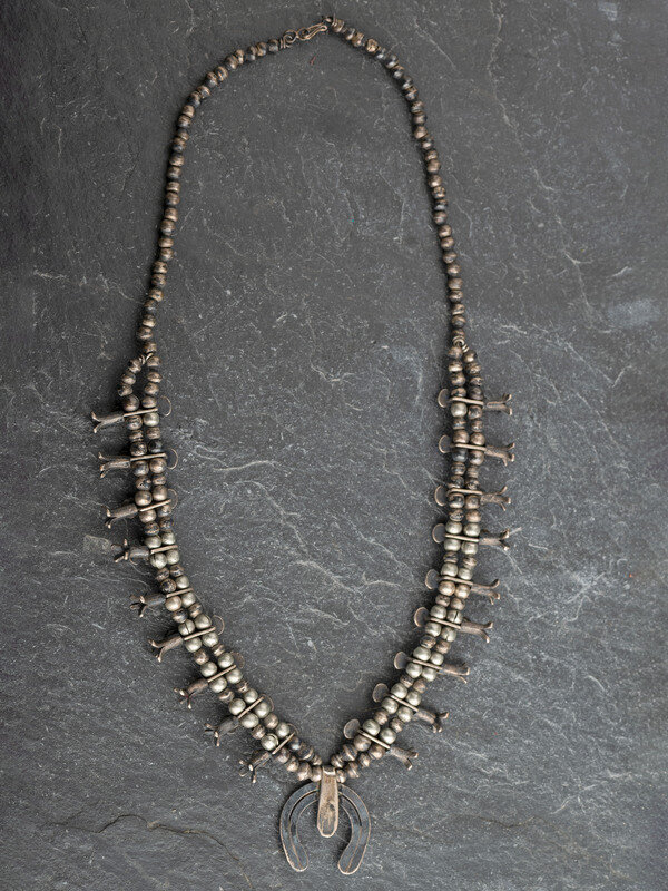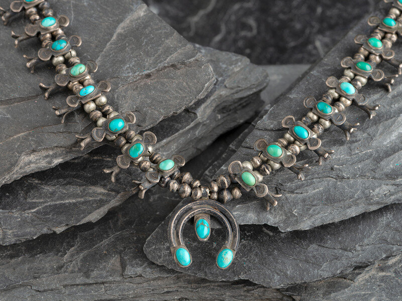 Navajo Child's Silver and Turquoise Box Bow Squash Blossom Necklace