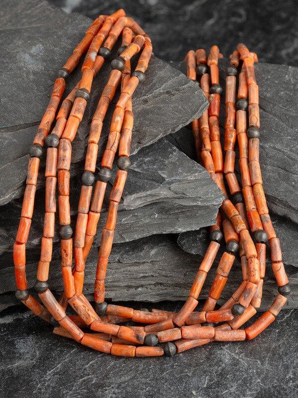 Pueblo Six-strand Coral Necklace with Silver Bead Accents
