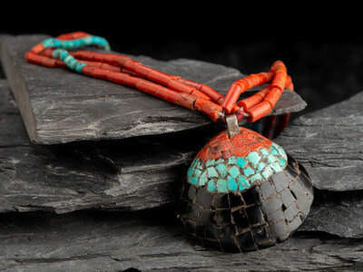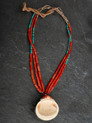 three-strand necklace strung with coral, rolled turquoise, and heishi; featuring a shell pendant set with jet, turquoise, and coral; not marked