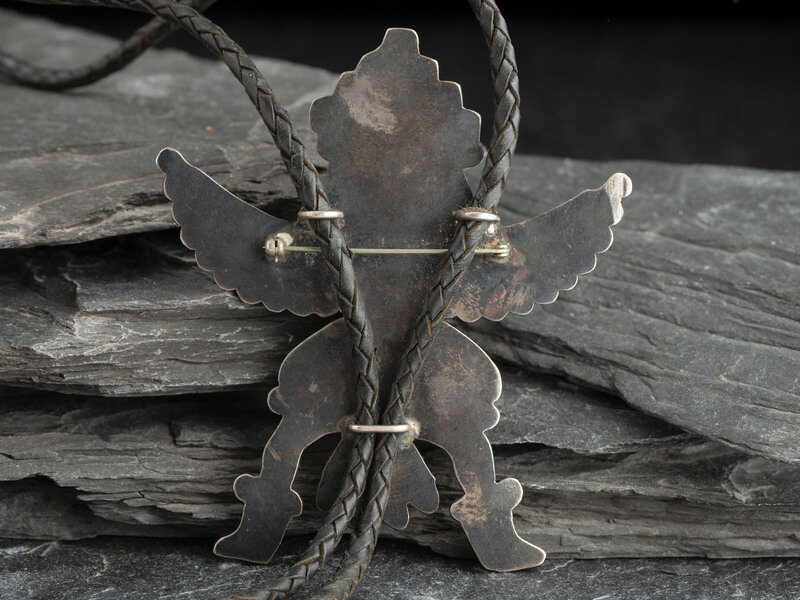 with carved feathered wings and tails; set with shell, turquoise, jet, and coral; not marked