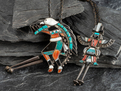 an eagle dancer set with spiny oyster, turquoise, shell, abalone, and jet