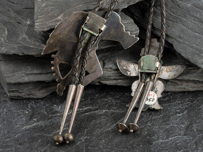 a Knifewing bolo set with turquoise, coral, shell, and jet