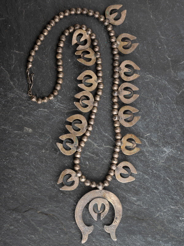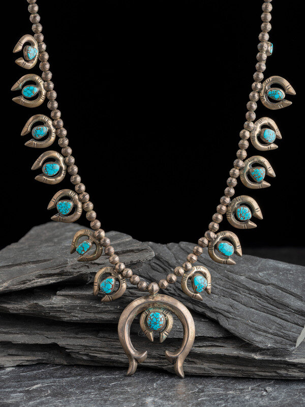 Navajo Silver and #8 Turquoise Squash Blossom Necklace