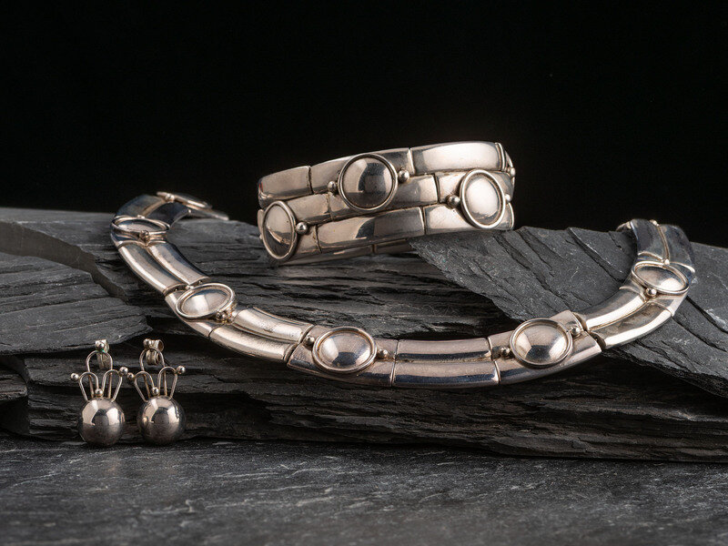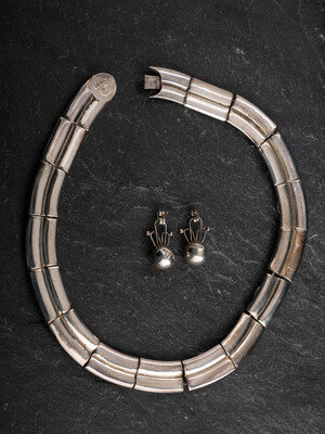 Taxco Sterling Silver Choker Necklace, Bracelet, and Earring Suite