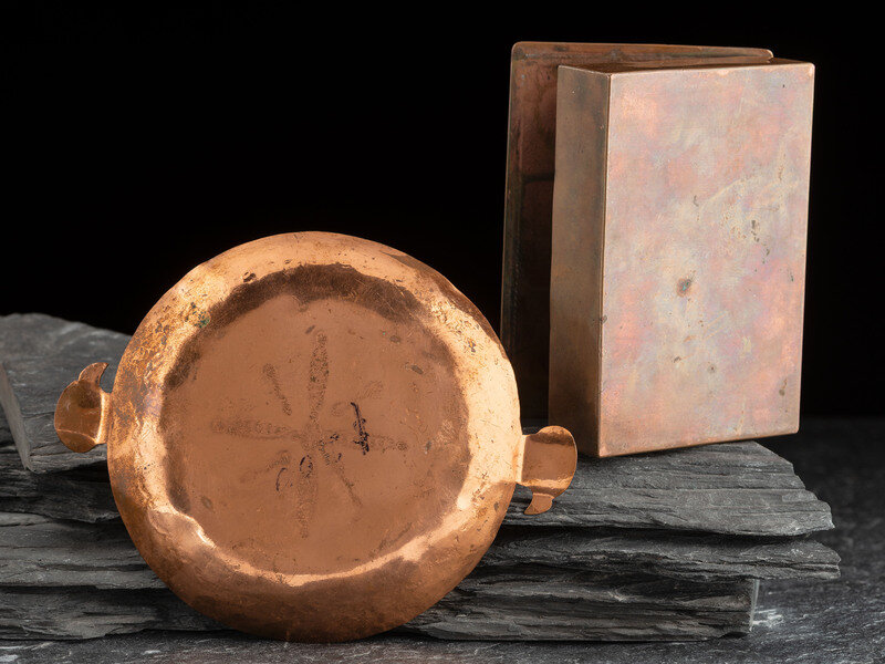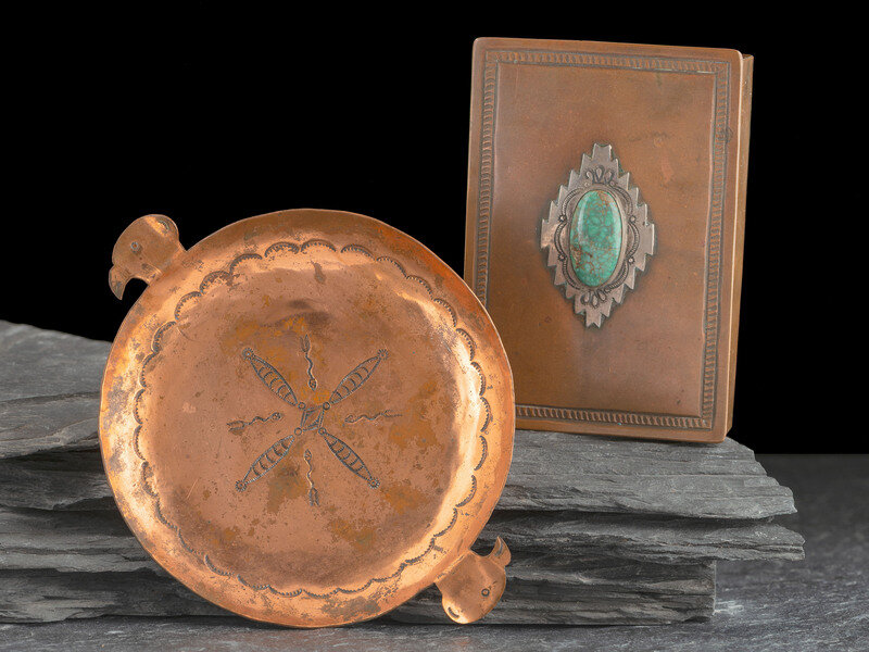 an avian ash tray with stamped decoration; marked UITA21 for South West Arts & Crafts, Santa Fe, NM