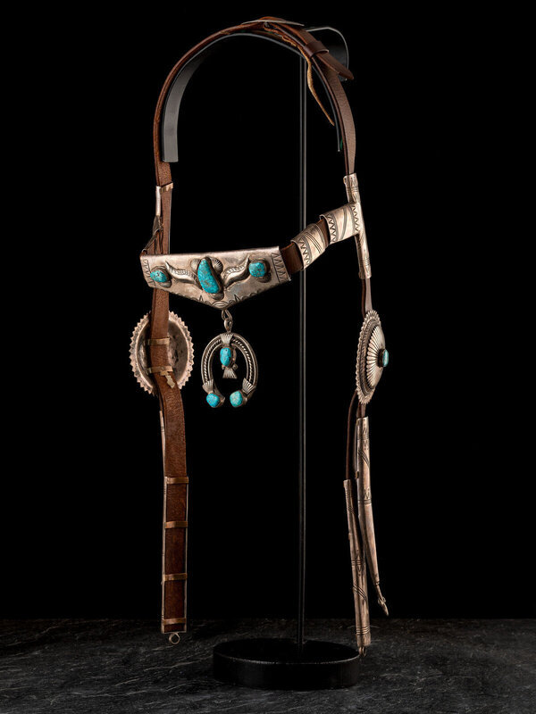 heavily stamped with the cheek conchas, browband, and naja set with turquoise; marked FA