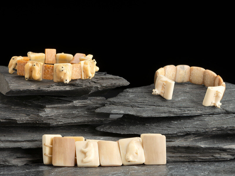 one with carved animals in relief, including bear, walrus, seal, whale, and dolphin; signed by Lincoln Milligrock