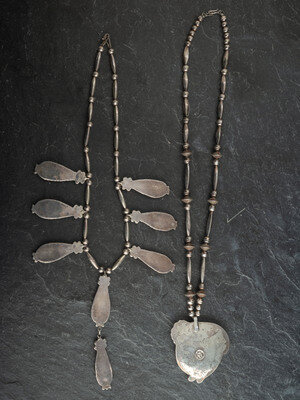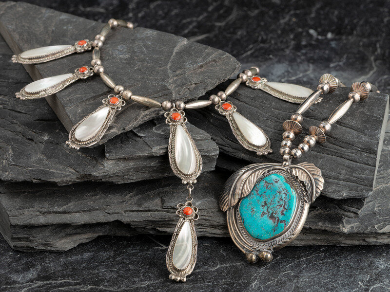 the other, features a pendant set with turquoise; marked WA inside a sun