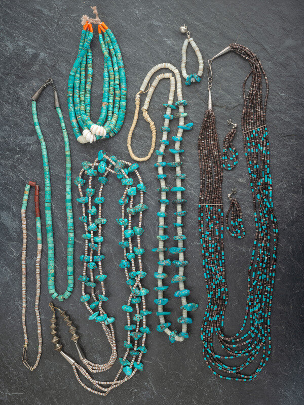 lastly, a single-strand necklace strung with heishi, turquoise, and pipe stone