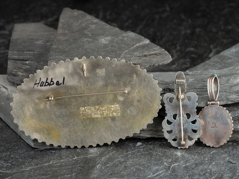 a Southwestern-style turquoise cluster pendant; marked STERLING with a leaf hallmark