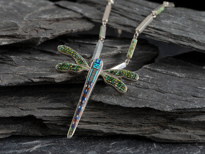 Sterling Silver Micro Mosaic Dragonfly Pendant, with Micro Mosaic Chain