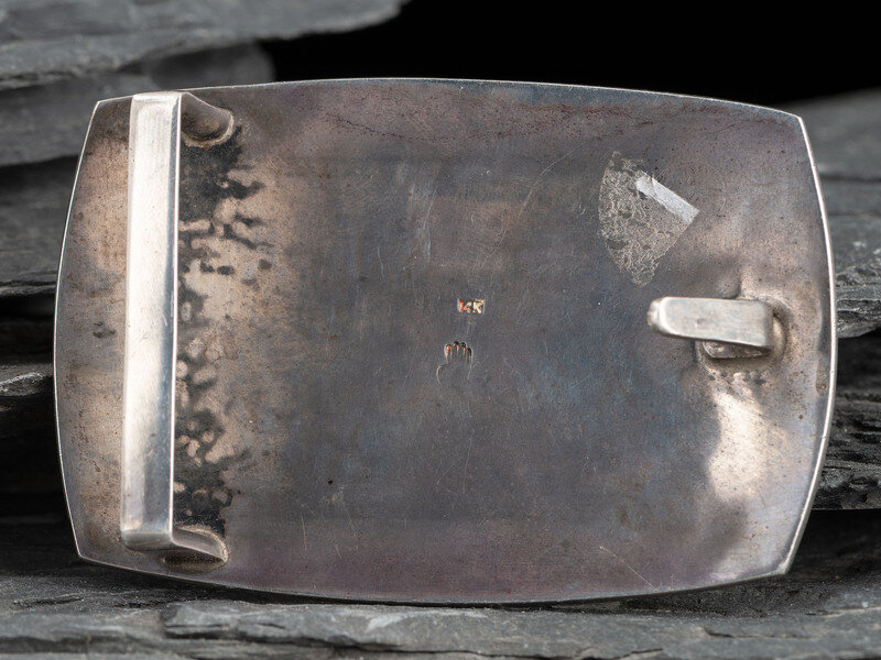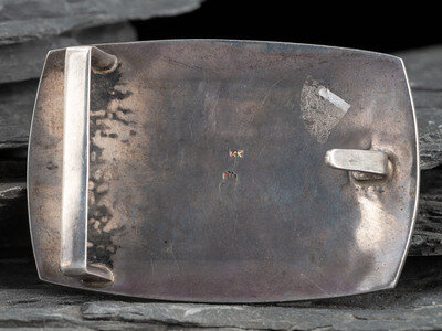 Sterling Silver and 14K Gold Belt Buckle, with Storming Pueblo and Mudhead Scene