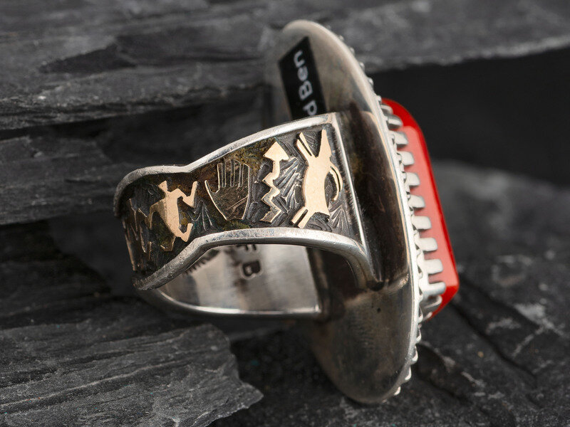 Sterling Silver and Coral Ring, with 14K Gold Petroglyph Accents