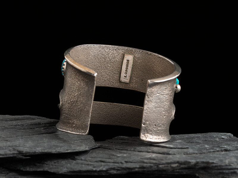set with turquoise, coral, and lapis; signed E. Cummings on interior