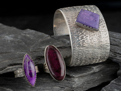Navajo and Zuni Silver Cuff Bracelet and Rings Set with Sugilite or Chaorite