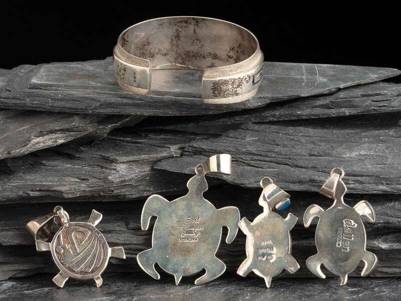 a silver overlay cuff bracelet with Greek Key design; marked STERLING and signed by Raymond Dalagyawma (Hopi, b. 1954)