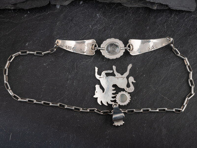 with 24k and 18K gold accents and set with turquoise and moonstone; signed on back of pendant and titled on back of clasp