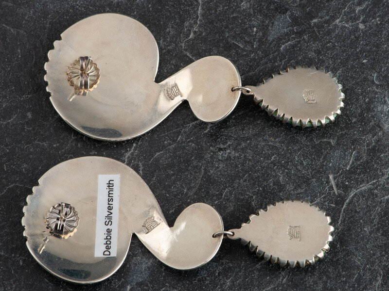 a pair of swirling post earrings, each set with a single stone; marked DEBBIE with hogan hallmark for Deborah Silversmith (Diné, b. 1957)