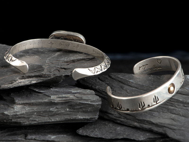 a cuff with silver overlay cactus scene and accented with a 14K gold bead; signed by James James Fendenhei (Tohono O'odham-Akmel O'odham, b. 1950)