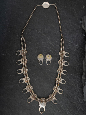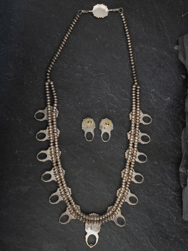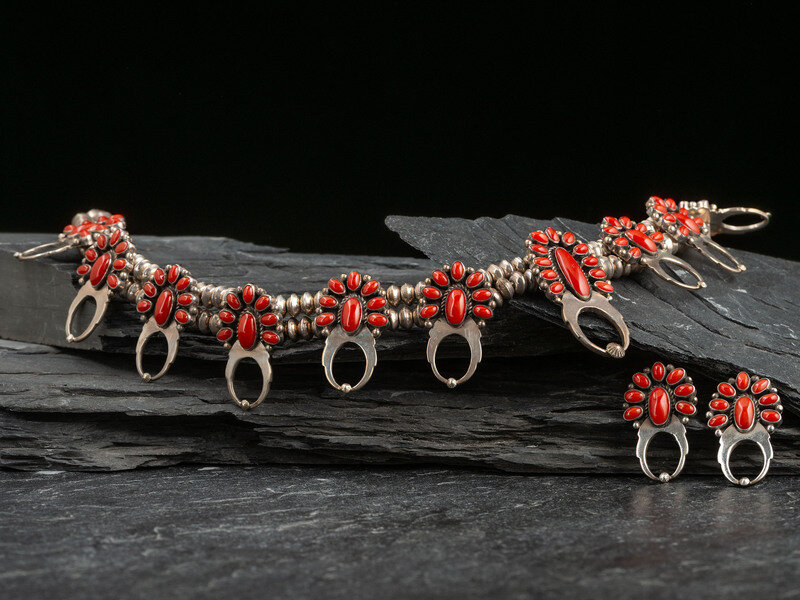 Navajo or Zuni Coral Cluster Squash Blossom Necklace and Matching Earrings