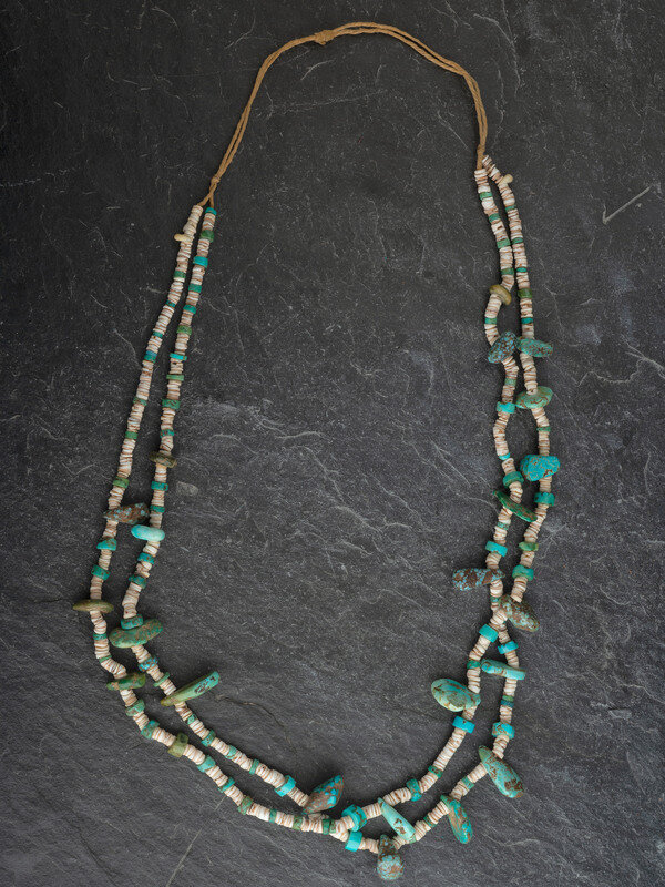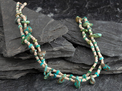 strung with heshi and high-grade turquoise tabs and rolled turquoise beads