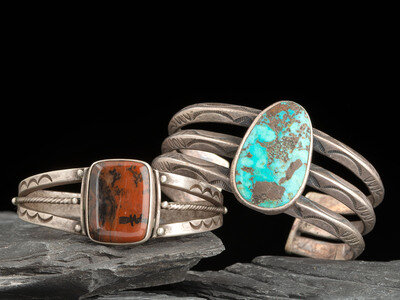 one with three stamped carinated bands comprising the cuff and set with a single turquoise cabochon