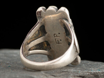 a split shank ring set with a rectangular stone in a twisted wire setting and accented with beads on the upper and lower edges; marked F.P.
