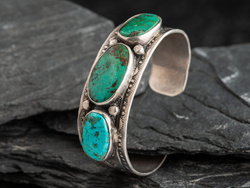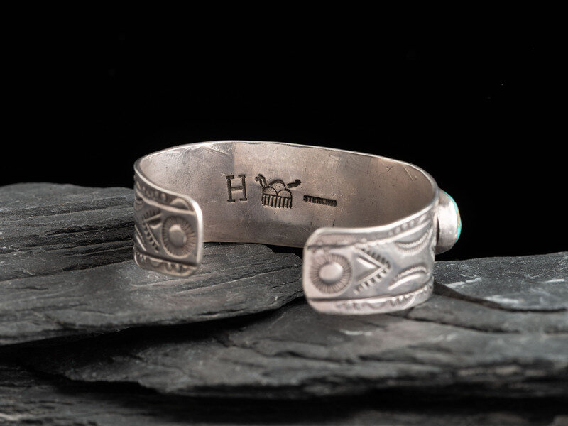 heavily stamped shank set with three oval turquoise cabochons; marked H with artist's raincloud hallmark and STERLING