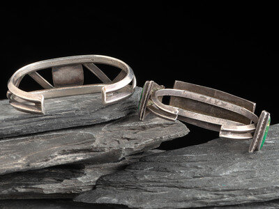 a sandcast example set with a single Bisbee Turquoise stone; not marked