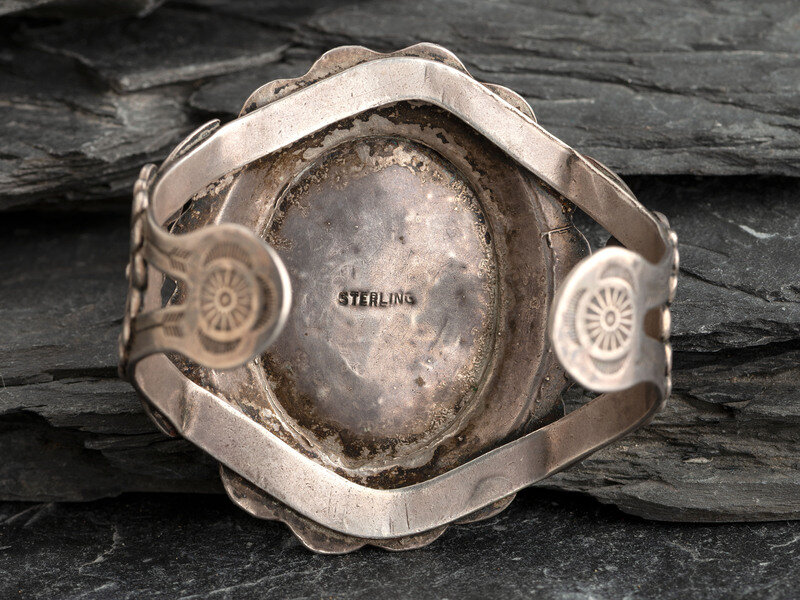 split shank cuff with stamping on the terminals; set with a large single turquoise cabochon in a stamped scalloped edge setting; marked STERLING