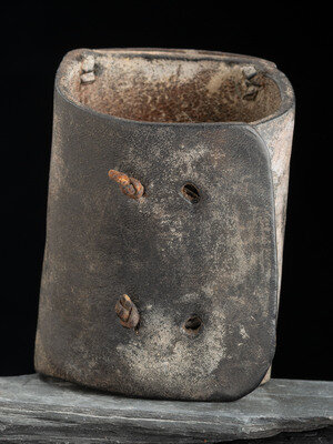 traditional form set with a central turquoise cabochon and accented with stamped repoussé