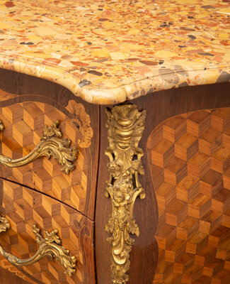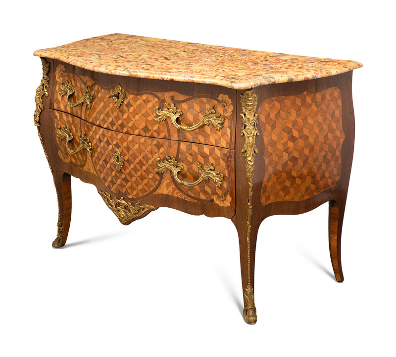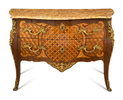 A Louis XV Gilt Bronze Mounted Parquetry Marble-Top Commode