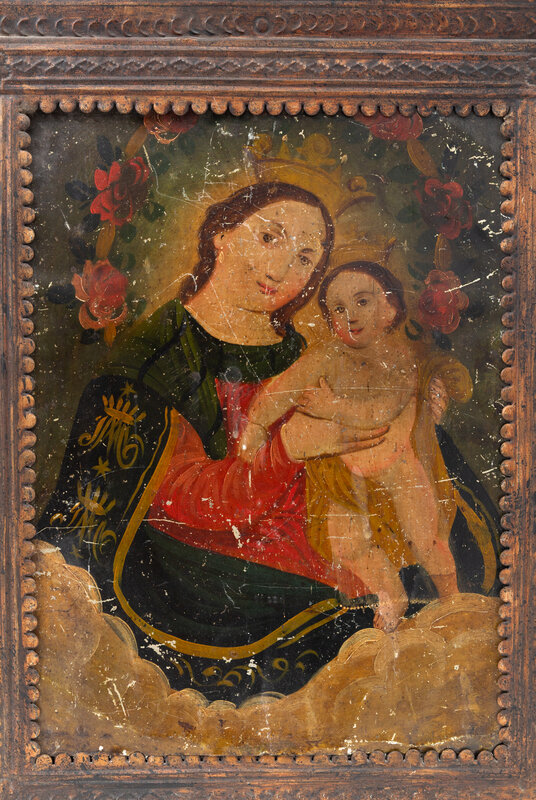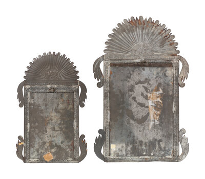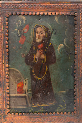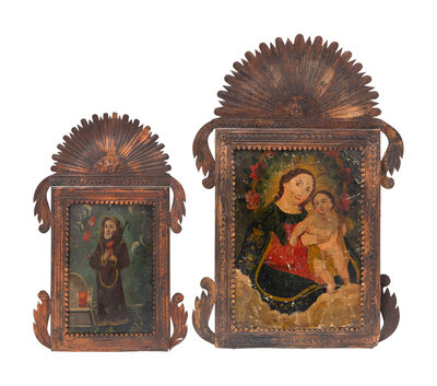 Two Spanish Colonial Retablos in Pressed and Painted Tin Frames