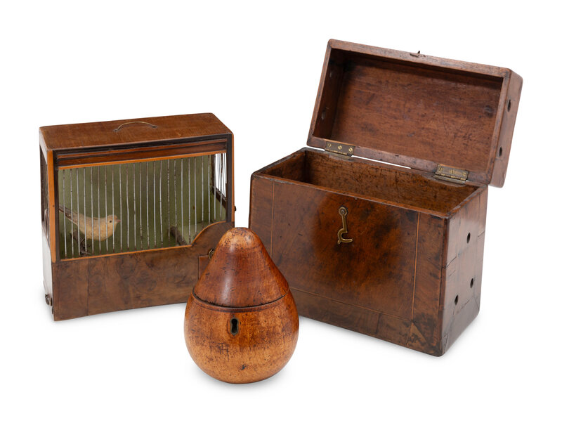 An English Walnut Finch Cage with Fitted Case and a George III Fruitwood Pear-Form Tea Caddy