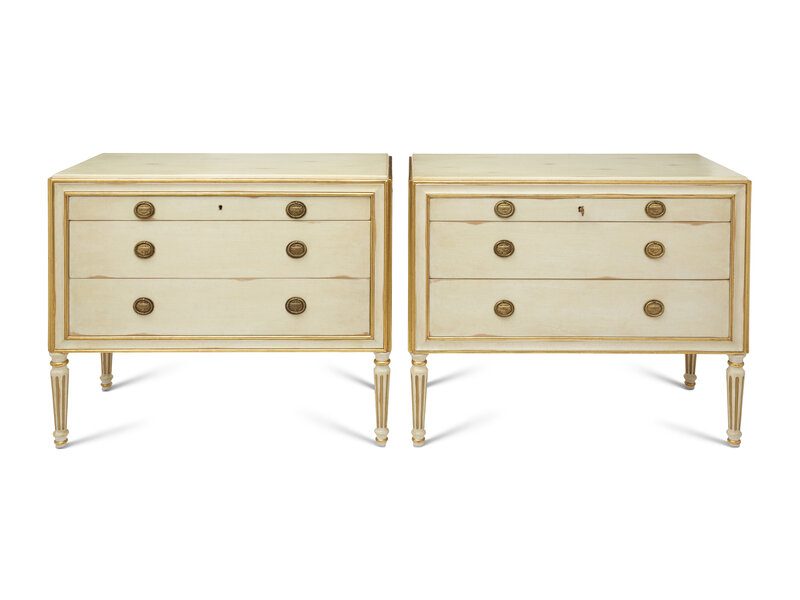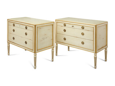 A Pair of Louis XVI Style Painted and Parcel Gilt Commodes