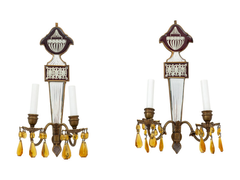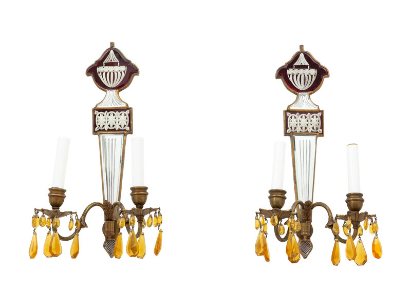 Comprising two with ruby cut-to-clear glass and two with cobalt, each mirrored and hung with amber glass drops; electrified.