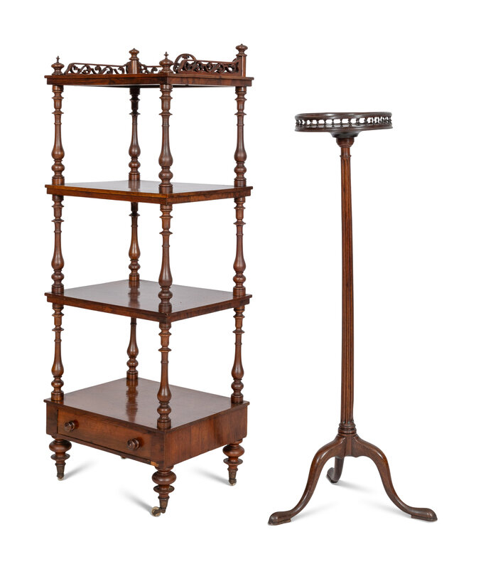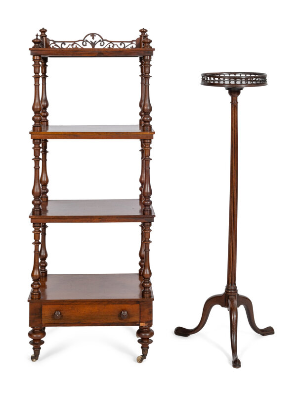 comprising a George IV mahogany etagere and a mahogany plant stand.