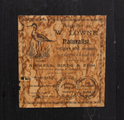 mounted with foliage in a diorama; preserved by W. Lowne, Naturalist, Great Yarmouth, England.