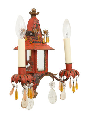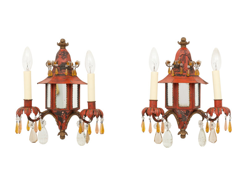 A Pair of Red Tole and Mirror-Inset Pagoda-Form Two-Light Sconces