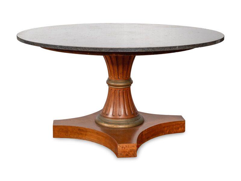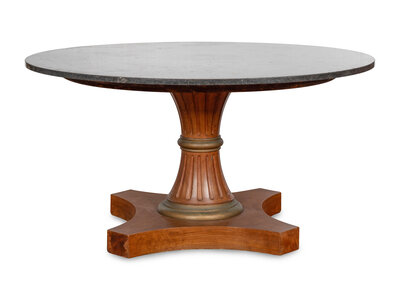 A Directoire Style Parcel-Gilt Walnut and Marble Top Pedestal Table