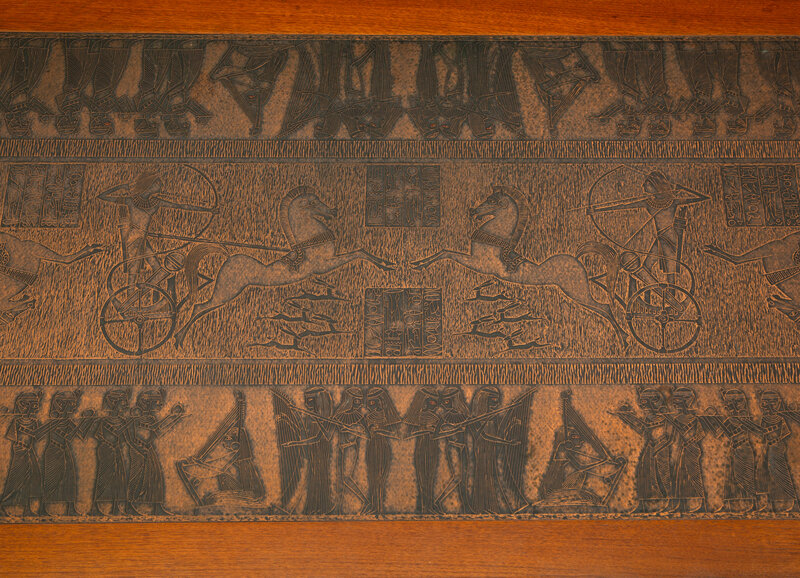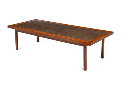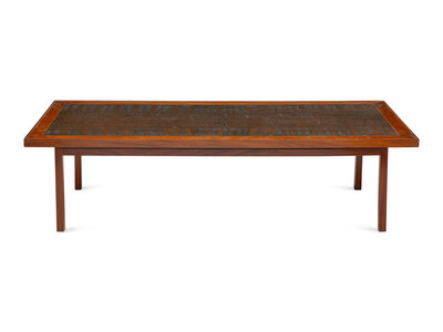 A Scandinavian Modern Teak Low Table with Egyptian Motif Stamped Copper Top