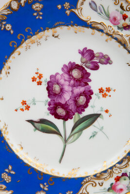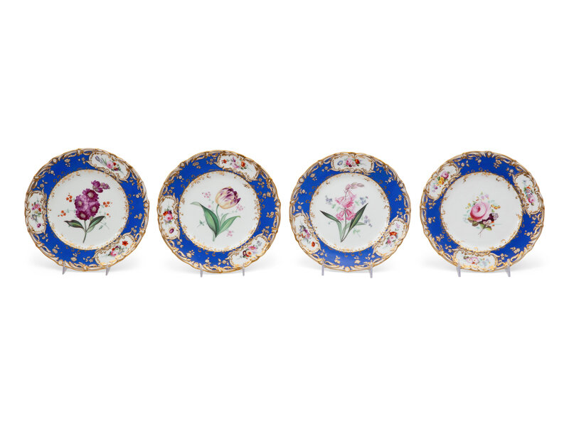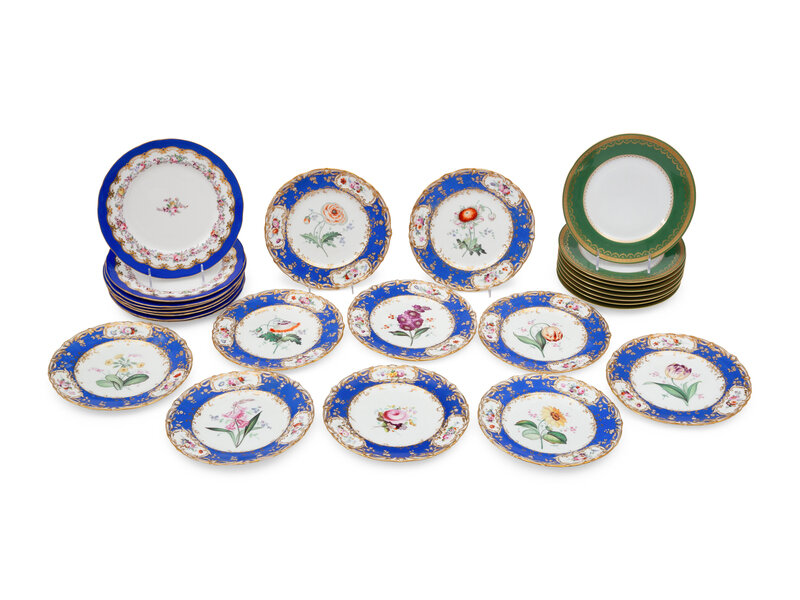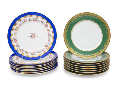 comprising a set of eight with green and gilt borders marked for Charles Ahrenfeldt, Limoges; a set of eight with royal blue and painted floral borders; and a set of ten with royal blue and gilt molded borders and large florals at center; 26 items total.